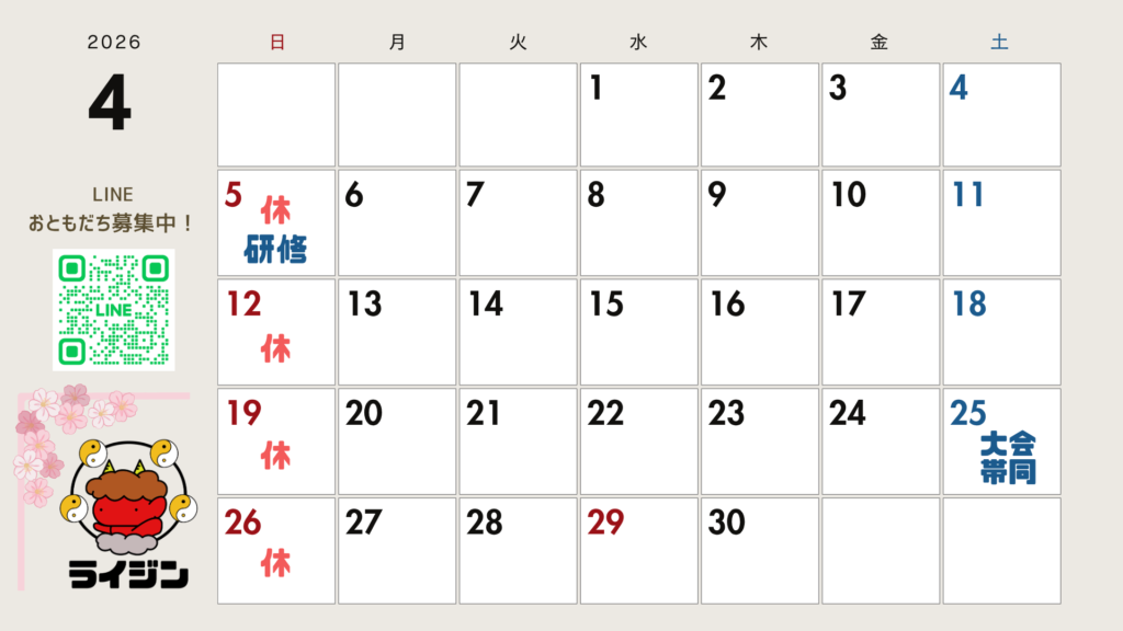 4月のスケジュール 2026年4月4日 最終更新日時 : 2026年4月4日 ShiraishiJin 本八幡ライジン治療院 4月のスケジュールとなります。 4/25は大会帯同のため、治療院はお休みさせていただきます。 4/29(祝)は通常同おり営業しております。 \ 最新情報をチェック / FacebookXBlueskyHatenaCopy